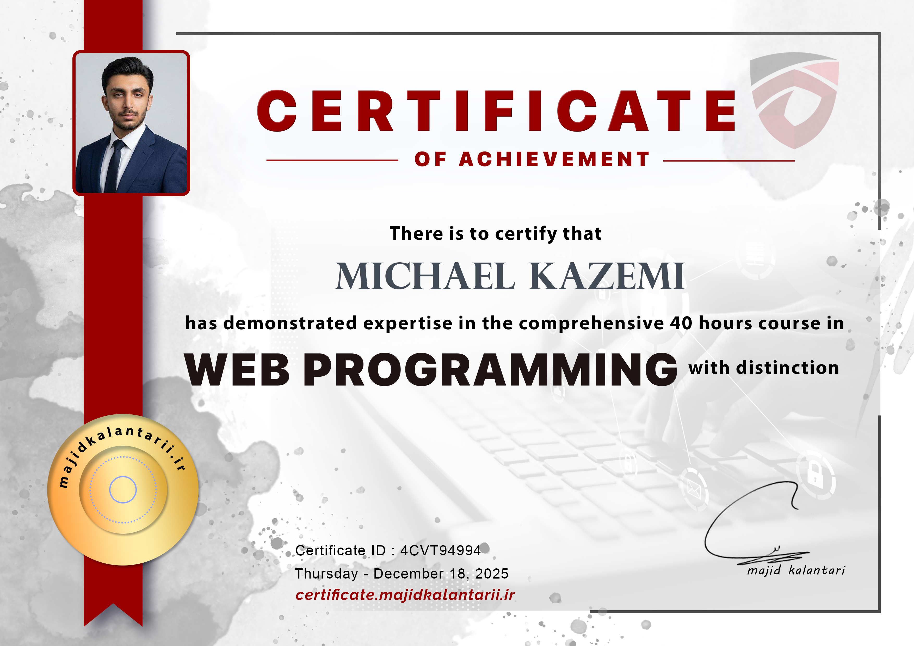 There is to certify that Michael Kazemi has demonstrated expertise in the comprehensive 40 hours course in Web programming 1 with distinction Thursday - December 18, 2025